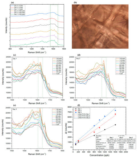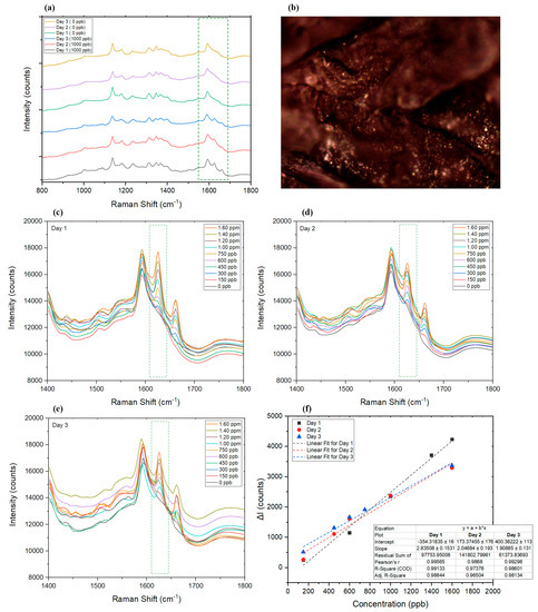 The effect of aging dried saliva samples has also been investigated up to 3 days after the samples were collected on the AgNP substrate (Figure 7a,c). Figure 7a compares the Raman spectra of dried saliva samples in the presence and absence of AMT on three different days. It can be seen that the intensity of AMT peak strengthened each day, which was assumed to be related to the degradation of molecules in saliva that allowed AMT a better contact with AgNPs to enhance the signal response, while AMT molecules remained almost intact [92] (Figure 7f). The R2 factor calculated for the linear fit of the Raman spectra was calculated to be 0.99, 0.98, and 0.98, on days 1, 2, and 3, respectively. For periods longer than 3 days, fewer samples were found to follow a linear pattern. The results of analyzing dried saliva control samples are summarized in Table 3.
