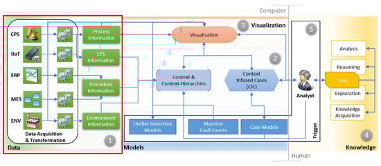 - Kaupp, L.; Nazemi, K.; Humm, B. Context-Aware Diagnosis in Smart Manufacturing: TAOISM, An Industry 4.0-Ready Visual Analytics Model. In Integrating Artificial Intelligence and Visualization for Visual Knowledge Discovery; Kovalerchuk, B., Ed.; Studies in Computational Intelligence; Springer: Cham, Switzerland, 2022; Volume 1014, pp. 403–436. [Google Scholar] [CrossRef]