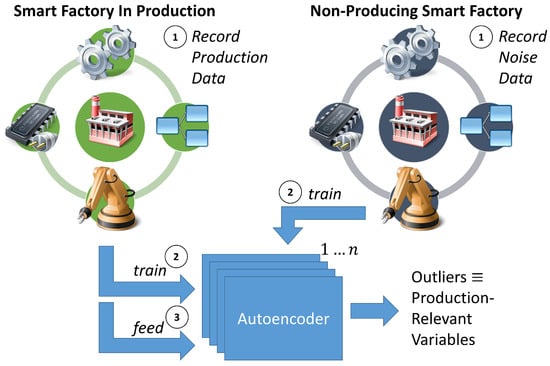 Overview flowchart of the training and selection process. (1) The smart factory is recorded twice: in production and non-producing. (2) The AEs are trained on the recordings. (3) Production data are fed to the AEs to detect production-relevant variables.