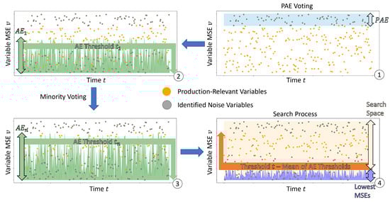 Illustration of AE-Ensemble Utilization. (1) Production AE (PAE) removes outliers from production data to clean the . (2–3) Each AE reconstructs the events encompassed in differently and flags events as noise (minority voting). (4) The search process starts from the mean of all AE Thresholds and increases until only the computed N production-relevant variables are left.