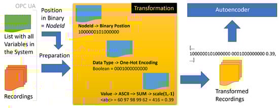 A transformation strategy should treat all data types and values equally, regardless of the data type. We choose a simple strategy to encode each event numerically for the AE training (see Figure 5). First, the nodeid is transformed into a binary representation. For that, the position of the unique variable in the list of 33,089 variables is transcoded into binary (e.g., position 33,089 > 1000000101000000). The transformation saves feature space in contrast to an otherwise one-hot encoding of the categorical values. Next, each value is transformed to the sum of its ASCII representation. Lastly, the data types are one-hot encoded. The date column is only used to sort the events and is pruned afterwards. Additionally, each value is scaled between −1 and 1 to reduce the distance between the categorical transformed nodeid and the one-hot encoded datatypes.