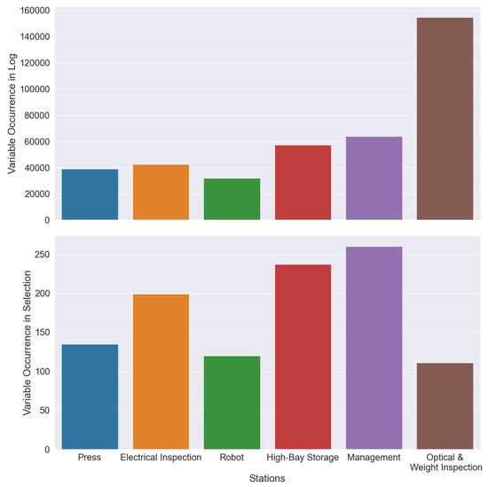 After the selection procedure, the result set of 1063 variables becomes differently weighted (Figure 7, bottom). First, the finding is that the result set is in line with the expectations. The Management station, which is involved in every production step, is selected more often (>250 OPC UA variables). The Management station sends production instructions and receives production status updates. The High-Bay Storage and the Electrical Inspection have been selected more frequently (>200 OPC UA variables). The High-Bay storage is involved in every production cycle twice (deployment of materials, storage of factored relays). Therefore, the amount of OPC UA variables doubled, which is reasonable. The Electrical Inspection has multiple proof routines for different relays. As a result, the chosen variables have the second highest frequency. The Press and the Robot are selected as approximately equal. For instance, the Robot and the Press employ the same routine for every relay every time, which is reflected by the equal amount of chosen variables. Ergo, the frequencies of both stations are reasonable. Besides, for the Optical & Weight Inspection, the result set mirrors the frequencies of pData. The Optical & Weight Inspection has a lot of ground noise, where the components send massive value-changed events. The emission happens for two reasons. Optical & Weight Inspection is currently under active development, and variables are emitted more frequently for debugging. The other reason is that many proof routines malfunction through active development and send erroneous feedback to the Management station after every production instruction. As a side-effect of the development process, the active or influential OPC UA variables during production are less, than the variables of the Press and the Robot station. Therefore, the frequency of the chosen OPC UA variables of the Optical & Weight Inspection station is also reasonable.