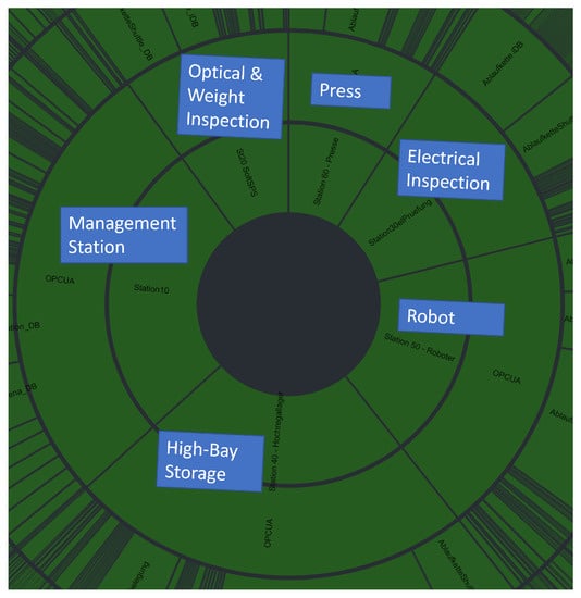 Figure 8 visualizes the proportion of variables in the OPC UA hierarchy under each CPS in a sunburst chart. The larger the section is, the more variables are contained its subtree. The sunburst chart allows a direct comparison between all variables (33,059 variables, Figure 8) and the result set (1063 variables, Figure 9). In Figure 8, the Management station has most variables, followed by the High-Bay Storage. The Robot has more variables than the Electrical Inspection. Optical & Weight Inspection has fewer variables than the Press. An important finding is that the presented approach retains the proportions of the OPC UA hierarchy during the selection process. The OPC UA hierarchy is approximately equally downsized from 33,059 variables to 1063 variables. The AE ensemble automatically performs the reflection during minority voting without explicitly specifying the behavior during training. This is significant as we train our AEs on continuous subsets of all OPC UA variables rather than setting an AE for specific CPS. We can also show that over-represented variables (Figure 7, top) do not influence our approach as the number of selected variables of the Optical & Weight inspection CPS (Figure 7 (bottom) and Figure 9) is reduced to the approximately same percentage as represented in the OPC UA hierarchy (Figure 8). Moreover, Figure 9 is also an overview of the share of a CPS on the production process available via the production-relevant variable selection.