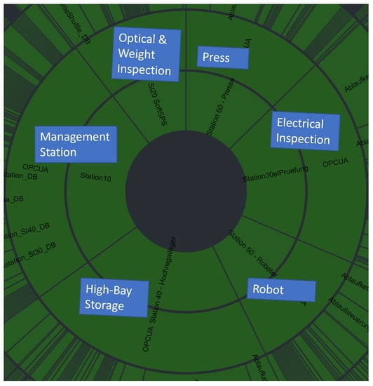 The results, 1063 chosen OPC UA variables, are shown in figures (Figure 7 and Figure 9). Figure 8 provides an overview of the complete OPC UA Hierarchy for comparison to Figure 9. Figure 7 compares the number of variables before and after the selection was performed on pData. In pData (Figure 7, top with 389,990 value-changed events), the Optical & Weight Inspection is over-represented with >140,000 value-changed events. Furthermore, the Management station and the High-Bay Storage have around 80,000 value-changed events. Additionally, the Press and the Electrical Inspection have the same level of value-changed events (40,000 events). The Robot has the smallest amount of all recorded changed-value events (>30,000 events). In pData, value-changed events are not equal to the number of recorded OPC UA variables because some OPC UA variables (e.g., the axes of the Robot) will drastically change multiple times during production. Each change emits a value-changed event. The production data set encompasses 33,059 OPC UA variables. Therefore, the recorded production data set has a 99.9% coverage of all smart factory variables (33,089 variables). Consequently, recorded production data (pData) are representative.