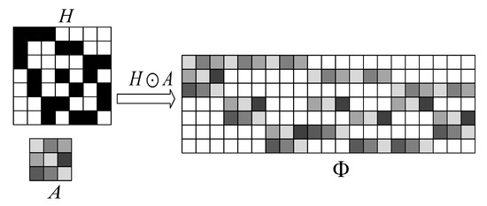 Let , where is the i-th column of H, has d “1", . In addition, A is a matrix with size -dimensional, each element 1 in is substitute for a distinct row of A, and each element 0 is substitute for the row vector . The result matrix Φ is expressed as