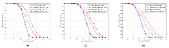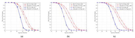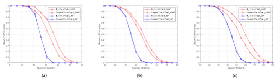 Figure 7 shows the reconstruction SNR comparison of , and with Toeplitz, Toeplitz and Toeplitz under OMP and BP, respectively. It shows that the reconstruction SNR effects of , and are better than those of , and under OMP, respectively, and their reconstruction SNR effects are similar to those of , and under BP, respectively.