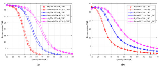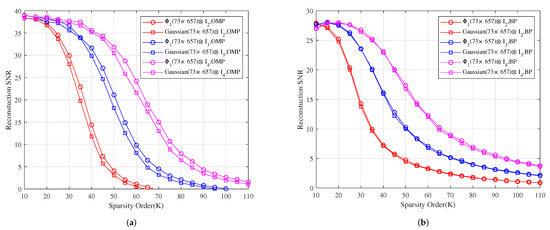 The relationship between the reconstruction SNR and sparsity order of sparse signals under OMP and BP. (a) The reconstruction SNR comparison of , and with Toeplitz, Toeplitz and Toeplitz under OMP, respectively. (b) The reconstruction SNR comparison of , and with Toeplitz, Toeplitz and Toeplitz under BP, respectively.