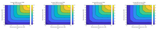 For sparsity order , the relationship of average recovery SNR and noise in measurement domain and data domain. (a) Average recovery SNR of as the measurement matrix under OMP. (b) Average recovery SNR of Gaussian as the measurement matrix under OMP. (c) Average recovery SNR of as the measurement matrix under BP. (d) Average recovery SNR of Gaussian as the measurement matrix under BP.
