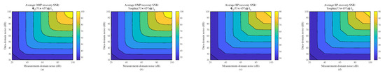Let , be the additive white Gaussian noise with SNR 20–100 dB. Figure 8, Figure 9 and Figure 10 show the comparison average recovery SNR for , and with Gaussian, Bernoulli and Toeplitz under OMP and BP, respectively. The stable and robust empirical effects of , and are similar to Gaussian, Bernoulli and Toeplitz, respectively.