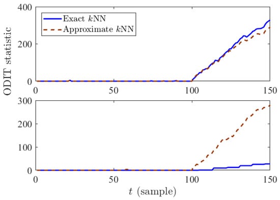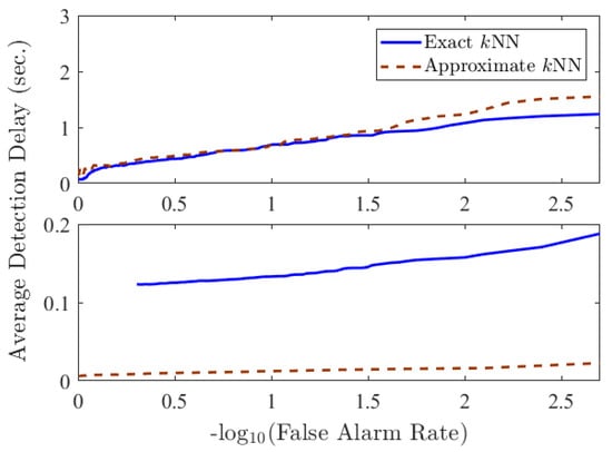 To compare the original and efficient ODITs in systems with different specifications, in terms of the frequency of data arrival, we considered the following two scenarios: (i) data arrives every 1 s, and (ii) data arrives every s. Figure 2 and Figure 3 compare the decision statistic given in Equation (8) and average performance of ODIT based on exact and approximate kNN in the two scenarios. Considering the extra samples needed for detection after the anomaly onset, as well as the computation time overhead for the last sample before detection, the actual detection delay in time unit is given by . Depending on the sampling period, either exact kNN or approximate kNN could be more advantageous. For a sampling period that is smaller than the computation overhead, exact kNN computations are usually not feasible, causing the original ODIT to miss multiple samples while performing the test for a data instance, as can be seen in the staircase statistic in solid blue in the bottom figure of Figure 2. Therefore, in such a case, approximate kNN computations are preferred over the exact kNN computations in terms of the actual detection delay (see the bottom figure in Figure 3). Whereas for a sufficiently large sampling period, the delay is mainly due to the extra samples, thus exact kNN computations yield better results this case, as shown in the top figure in Figure 3.
