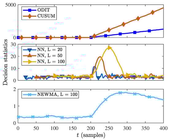 The decision statistics of the four algorithms CUSUM, ODIT, NN and NEWMA are shown in Figure 5. The anomaly (change-point) occurs at time . As the observations after are from a different probability distribution with respect to the nominal data, the ODIT and CUSUM statistics start increasing steadily after . On the other hand, the NN and NEWMA methods, which are both window-based methods, show increase in the decision statistics when the change point falls within the test observation window, and decrease after the window passes the change point. Since for smaller window sizes the increase in decision statistics is smaller, the NEWMA and NN algorithms can fail to detect the change point due to the small window size.