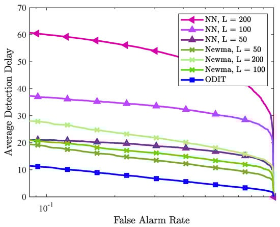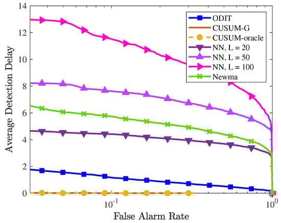 The performances of all detectors are compared in Figure 6. The performance of NN for different window sizes confirms that, as the window size increases, the change point is detected with a larger delay. In this experiment, all algorithms achieve 100% detection, that is, the change point is detected in all trials for all false alarm rates. In terms of average detection delay, CUSUM and generalized CUSUM (CUSUM-G) achieve almost zero detection delay since the assumed probability distribution (multivariate Gaussian) conforms with the true one. However, in real-world applications it is typically not possible to know the true pre- and post-change probability distributions, which consequently limits the applicability of CUSUM and CUSUM-G in real-world applications. The proposed ODIT detector achieves much smaller detection delay compared to the practical competitors (NN and NEWMA) from the literature. The window size gave the best performance for NEWMA.