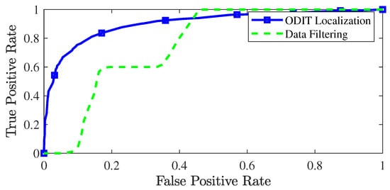 The ROC curve of ODIT for localization of the anomalous dimensions is shown in Figure 7 and compared with the straightforward data-filtering approach since the state-of-the-art detectors do not have a procedure for anomaly localization. The AUC for ODIT localization achieves while the detector satisfies the false alarm rate of . The conventional data filtering approach identifies a dimension as anomalous if its value exceeds a predefined threshold. Due to the small change ratio in the experiment, the data filtering approach fails to attain high identification probability while satisfying small false positive rates.
