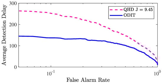 The nonparametric nature of the proposed ODIT detector makes it suitable for multivariate detection in high-dimensional and heterogeneous systems. We next show the advantage of ODIT over a state-of-the-art correlation change detection method [] in a challenging setting where anomaly is manifested as a change in the correlation structure between the individual data streams. The practical importance of this type of anomaly is well exemplified by the MadIoT attacks introduced in [], in which high wattage IoT devices, such as air conditioners and water heaters, are synchronously turned on/off to cause instability and as a result blackout in the power grid. Following the experiment settings presented in [] we simulate a 100-dimensional system that nominally generates data from a multivariate Gaussian distribution with diagonal covariance , where is the randomly chosen variance for each dimension. After the change point , 10 data streams become correlated. Specifically, the post-change covariance matrix is generated by replacing a random block of with a random matrix sampled from the Wishart distribution. We make sure that the pre-change and post-change variances remain the same and only the correlations change. The size of the nominal training dataset is . The detector proposed in [] (QHD) is a nonparametric quickest change detection algorithm that focuses on detection of change in the correlation structure of data. Similar to ODIT, it aims to minimize the average detection delay while satisfying a false alarm constraint. The considered problem is significantly more challenging than the change-in-the-mean problem due to the fact that the mean and variance of individual data-streams do not change. In particular, data instances after the anomaly onset are still very similar to the nominal instances. To cope with the similarity of the anomaly instances to the nominal ones, the parameters of ODIT algorithms are set to be , . Figure 8 compares the detection performances of ODIT and QHD. The J parameter of QHD is optimized as . As seen in the figure, especially in the low FAR regime, ODIT successfully minimizes the average detection delay compared to QHD, which specializes on correlation change detection.