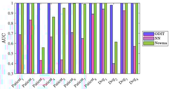 Next, as a real-world application we consider the problem of detecting seizure in intracranial EEG signals. For patients unresponsive to the medication, the quick and accurate detection of seizure onsets are crucial for timely neurostimulation treatment to be effective and stop the seizure. Therefore, seizure detection is a suitable application to evaluate our proposed method. We use the dataset provided in a Kaggle competition, namely UPenn and Mayo Clinic’s seizure detection challenge. The dataset contains EEG signals of 12 subjects, 8 human patients, and 4 dogs. The dataset for each subject is provided in clips of duration 1 s. (with varying number of samples due to different sampling frequencies), where each clip belongs to either interictal (nominal) class or the ictal (seizure or anomaly) class. The dimensionality of signals for each subject varies due to different number of electrodes for signal sampling. The ground truth (i.e., nominal/seizure labels) are not available for the test data clips provided in the dataset. Therefore, we trained the algorithms on a portion of the training data, and tested them on the rest of the training data. For each subject, we trained ODIT on a nominal dataset of size N = 20,000 and arranged the testing data for each trial to contain 200 nominal samples followed by 200 anomalous samples. The algorithm parameters in this experiment are set to be , . Figure 9 demonstrates the performance comparison of the methods in terms of average detection delay vs. false alarm rate, averaged over all the subjects. ODIT can detect seizure as early as 10 samples after the seizure onset when only of the detections are false alarms. With the same window size, NEWMA achieves smaller average detection delay compared to NN, both of which achieve detection delay around 20 samples while satisfying FAR for window size 50. As the window sizes of NEWMA and NN increases, the detection delay increases for both algorithms. ODIT achieves the lowest average detection delay, as well as the highest AUC for detection, as shown in Figure 10 (AUC is 1 for all subjects except for the subject Dog 2, for which the AUC value is ). According to Figure 10, NEWMA outperforms NN (both with window size ) in terms of AUC for each patient.