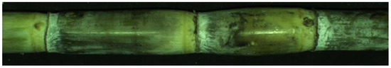 In this paper, the sugarcane variety Xintaitang 22 was taken as the research object. Figure 1 shows a sugarcane stem. Sugarcane stems are mainly composed of stem nodes, internodes, leaf marks, and buds, as shown in Figure 1. The stem nodes are distributed at approximately 90° to the axis of the sugarcane along the radial direction, and internodes are located between the adjacent stem nodes, on which there are cane buds [19]. There are leaf marks on the stem node and the gray value on both sides is different, so we carried out stem node recognition according to the characteristics of the leaf marks.