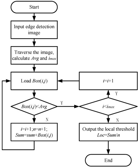 After edge detection by the gradient operator, binarization is required. For different images, using a fixed threshold value will lead to the failure to find the real edge accurately. Therefore, a local threshold determination method is proposed in this paper. First, the image was traversed to calculate the average gradient value of the image. Then, the prediction boxes obtained by the YOLOv3 model were utilized. There was a high probability of sugarcane stem nodes appearing in the prediction boxes. The gradient value of the stem node was larger, and the gradient value between the stem nodes was generally low. The gradient value of the region influenced by wax powder and broken leaves. To reduce this noise, the threshold value should be as large as possible. Therefore, it was necessary to eliminate all points in the prediction box whose gradient value was lower than the average of the image gradient value. The average gradient value of the remaining points in the prediction boxes was calculated to obtain the local threshold, which was used to binarize the image. Figure 10 is the flow chart of local threshold determination algorithm.