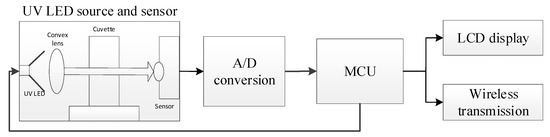 The portable photoelectric detection system based on wireless transmission mainly consists of an ultraviolet light-emitting diode (LED), a convex lens, a photoelectric sensor, an analog to digital (A/D) conversion module, a microcontroller unit (MCU) minimum system, liquid crystal display (LCD), a wireless transmission module, etc. The UV LED adopts 3535UVC from Shenzhen Gushitai Industrial Co., Ltd., Shenzhen, China, with a central wavelength of 270 nm, a wavelength range of 260~280 nm and the size of 3.5 × 3.5 mm. The convex lens has a concentrating effect on the light, which can prevent the divergence of the light and improve the detection accuracy of the sample. The MUC adopts STC89C52 which is a low-power, high-performance 51 core CMOS 8-bit microcontroller. CJMCU-GUVA-S12SD is selected as the ultraviolet sensor module. The sensor has the advantages of low power consumption, good linearity, and high sensitivity, and its detection range is 240~370 nm with a size of 11 × 28 mm. The wireless transmission module esp8266 [15] is used to transmit the detection data to the host computer instead of the conventional serial data transmission, which makes the use space of the device more flexible and free from the constraints of data lines. The LCD1602 display module is used to display the absorbance value of the test sample. The structure block diagram is shown in Figure 1.