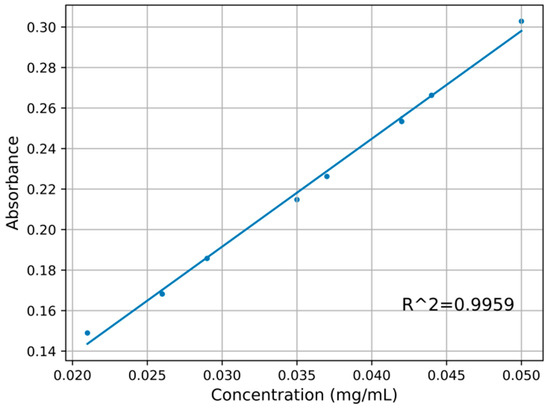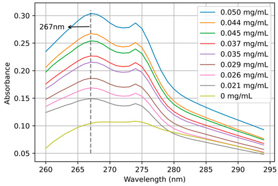 According to the sample preparation method described in Section 2.2, 30 groups of dihydrocoumarin solutions in coconut juice with different concentrations were scanned for absorption spectral characteristics with the UV spectrophotometer (UV6300, Shanghai Meipuda Instrument Co., Ltd., Shanghai, China). The absorption spectra of nine samples are shown in Figure 4. Obviously, compared with dihydrocoumarin, there is no absorption peak in pure coconut juice. By comparing the absorption peaks of coconut juice containing different concentrations of dihydrocoumarin, it was found that the absorption peak of dihydrocoumarin was near 267 nm. The higher the concentration of dihydrocoumarin, the greater the corresponding absorbance value. If we extract the absorbance at 267 nm in Figure 4, the concentration of dihydrocoumarin is linear with the absorbance, as shown in Figure 5. The absorbance of dihydrocoumarin at 267 nm has a strong linear relationship with the concentration of dihydrocoumarin, and the determination coefficient is 0.9959. The error bar obtained through three groups of parallel tests is also shown in Figure 5. It can be seen that it has good reproducibility and low error. Based on the above analysis, the concentration of dihydrocoumarin in the sample solution can be predicted by ultraviolet absorption spectrometry.