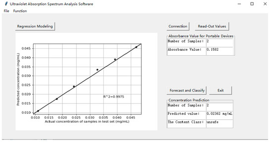 The operation interface of GUI software is shown in Figure 6, which mainly includes two functions: training set modeling and test set content prediction. The left area displays the results of content prediction in graphical form, and the right area displays the absorbance value, predicted concentration value, and preliminary sample classification result of the current test sample in text form.