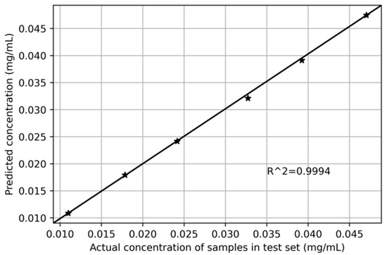 At the same time, we also used the UV6300 spectrophotometer to scan 30 groups of dihydrocoumarin sample solutions in coconut juice, and selected 24 groups as the training set, and the other 6 groups as the test set, which is the same as the portable detection system. Similarly, we applied the PSO-SVR algorithm to establish a quantitative function model, predict the concentration of dihydrocoumarin in coconut juice, and fit it with the actual concentration value to obtain the relationship between them. As shown in Figure 7, the black asterisk represents six samples of the test set, the horizontal axis shows the actual concentration of dihydrocoumarin, and the vertical axis shows the predicted concentration. The determination coefficient of the fitting result is 0.9994, which indicates that the prediction accuracy of the model based on the data measured by the UV6300 spectrometer is slightly better than that of the self-designed portable detection system.