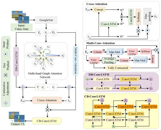 Figure 1 shows an overview of our hierarchical spatial–temporal cross-attention scheme for video summarization. DB-ConvLSTM, multi-conv-attention, and multi-head attention GAT are all used for video feature extraction. The DB-ConvLSTM is employed to extract coarse-grained global spatial–temporal video characteristics. Effective fine-grained local features are extracted using multi-conv-attention networks and spatial–temporal relational feature extraction using multi-head attention GAT. This research derives hierarchical spatial–temporal feature information on the basis of cross-attention, taking into consideration both global and local characteristics and coarse-grained and fine-grained features. In particular, this scheme promotes comparative learning for acquiring local feature information for multi-conv-attention and GAT, and obtaining global feature knowledge for DB-ConvLSTM and GAT. The local and global characteristics are combined using spatial–temporal cross-attention. Finally, CB-ConvLSTM obtains the video summary.