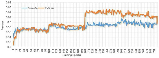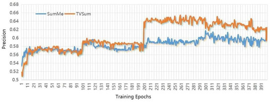 Before comparing the scheme to other state-of-the-art algorithms, it is vital to validate the scheme’s performance itself. Table 3 and Figure 7 show the results of evaluating the performances of our methods on the SumMe and TVSum datasets. From the perspective of result stability, the test variation curves of C, T, and A on SumMe and TVSum datasets are shown in Figure 8 and Figure 9. The horizontal coordinate of both figures is training epochs. Figure 7 gives an example of generating video summarization on the SumMe and TVSum datasets by our approach; the yellow lines show the annotation importance scores of ground truth summarization marked by the user, and the blue lines show the prediction score of our method. We clearly observe that our models achieve very competitive results against state-of-the-art methods.