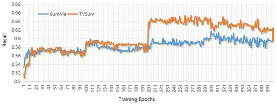 The deep learning platform for operating our approach is Pytorch. The hidden states are with dimensionality of 256 for ConvLSTM, and other parameters settings are as follows: similar to other algorithms, we use the pool5 layer of GoogleNet to extract the visual features for each video frame. The number of ConvLSTMs hidden layers is 256, the learning rate initialized is , the batch size is 5, the kernel size is set as (5,1), and the maximum training epoch is set as 100. Furthermore, considering that the training epochs are critical to summarization performance, after increasing for five epochs continuously, their influence on the validation set is plotted in Figure 4, Figure 5 and Figure 6. The horizontal coordinate is the training epochs, and the vertical coordinates are the values the of F-scores, Recall, and Precision.