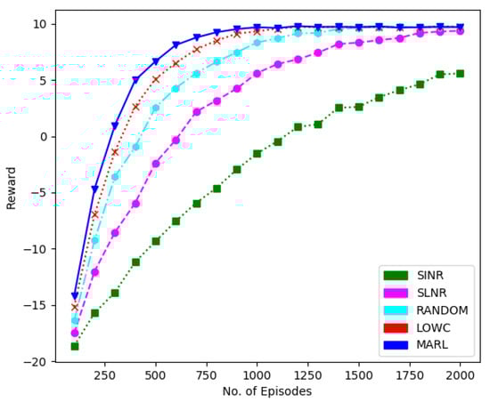 The first result shown in Figure 4 indicates the result when the user randomly selects a resource block for data transmission without considering the overall system capacity and other users’ priorities. We can see that the learning is mainly imbalanced and results in degraded performance. This is because the agent chooses action randomly and does not learn the environment’s dynamics. The experiment was conducted for 30 users, each with a single transmit antenna and four receiving antennas at BS.