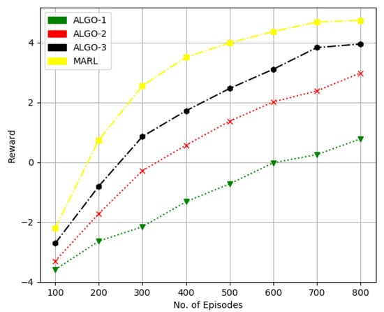 In Figure 7, we considered ten candidate users, each with a single transmit antenna and four receive antennas at BS. At the same time, we increased the total number of candidate users to 20 in Figure 7 while keeping other parameters the same. We can quantify that the RL-based method obtains about higher sum-rate performance than that of the ALGO-3 and quite significantly better performance over the other two schemes.