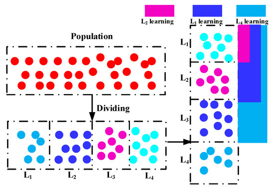 During the evolution process, individuals are often in a variety of distinct evolution states, each with a unique capability for exploring and exploiting the search space they are in. For the purpose of distinguishing between them, we first divide individuals into distinct levels based on their fitness ratings. To be specific, the number of N individuals can be divided into NL levels () regarding their fitness. Then, in such levels, better individuals are assigned to higher levels, with a lower level index corresponding to a greater degree of quality. As a result, the highest level is , and the lowest level is . In this study, the same number of individuals in each level is adopted, which is calculated by . In other words, individuals at a higher level often contain more advantageous information that may be used to drive the population toward the global optimal location. As a result, individuals at higher levels should direct those at lower levels to explore the whole solution space, allowing for rapid convergence and the discovery of interesting places. On the other hand, we observe individuals at various higher levels and discover that the higher the level to which an individual belongs, the more probable it is that the individual is near to the global optimal region. That is, individuals at various levels have varying degrees of exploitation strength. Similarly, individuals at various levels exhibit varying degrees of exploratory intensity. In other words, individuals with more exploitation potential often have less exploration potential, and vice versa. As a result, an individual at a lower level should learn from those at higher levels how to strike a balance between exploration and exploitation. The details of this idea can be seen in Figure 1. As seen in this picture, individuals at lower levels may possibly learn from particles at higher levels, and the number of possible exemplars for individuals at various levels varies. Specifically, when an individual’s level increases, it has fewer individuals at higher levels to learn from, which corresponds to the hypothesis that better individuals should engage in more exploitation than exploration. In general, this level-based learning may push individuals at lower levels to explore more and individuals at higher levels to exploit more.