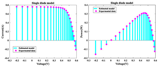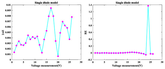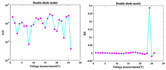 Figure 2 depicts the I-V and P-V fitting diagram of MLCPA for SDM. As noted, the I-V and P-V curves obtained from the model correspond well with experimental data over the whole voltage range. The error-index values for the computed electric current and the simulation test for this model are shown in IAE and RE values in Figure 3. It was determined to be less than 9.41557237E-03, and all RE values were between −5.668575E-02 and 1.368383E+00, indicating that the MLCPA is capable of substantially identifying the real attribute of SDM. Additionally, according to Table 5, there was an absolute individual error of 0.1058408 in this case, with a total of 0.0413232 inaccuracy between the trial and obtained data. These critical parameters in SDM can be clearly identified, and the provided technique MLCPA can also be completely supported on this topic.