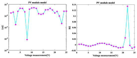 In this section, the MLCPA was used to address the issue of parameter estimation for the PV model example Photo Watt-PWP 201. As shown in Figure 6, across the entire voltage range, the MLCPA findings for I-V and P-V characteristics of the genuine data and the imitation records were in excellent agreement with the trial records. Additionally, Figure 7 shows the erroneous IAE and RE values. As seen in this figure, while the upper and lower limits for RE values were 1.34001E-01 (and −1.17285E-02, respectively), all IAE values were below 5.09229E-3. It can be concluded that MLCPA is capable of precisely measuring the real behavior of PV module modes. Additionally, Table 11 summarizes the IAE’s findings on PV mode, and the totals of these values were 0.06450231 and 0.752103455, respectively. Thus, it can be observed that the accuracy of the obtained parameters was adequate and of high quality, and the MLCPA’s performance on this issue was effectively confirmed.