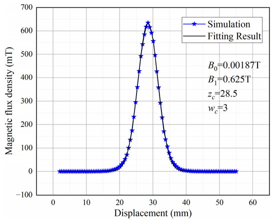 In this paper, it is considered that the wear debris passes along the axis of the flow channel. The magnetic field on the axis is nonlinearly fitted by the GaussAmp function. Figure 3 shows the curve for the magnetic flux density in the axial direction.