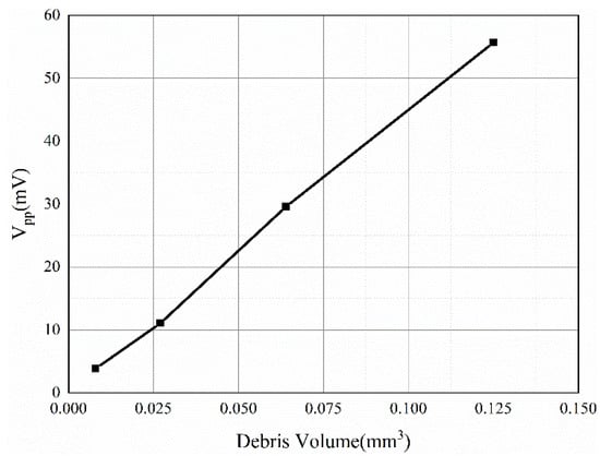 From Equation (7), the inducted voltage is found to be related to the volume and velocity of the wear debris. Experiments show that the Vpp value of the induced voltage is proportional to the volume or velocity of the wear debris. Therefore, the Vpp value for the induced voltage can be expressed as: