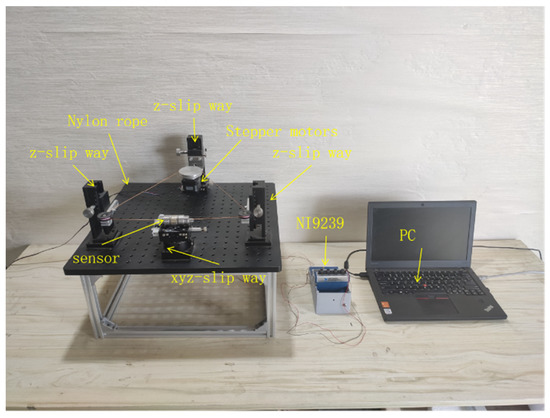 The single wear debris experimental device is shown in Figure 11, which consists of a wear debris sensor, fixed pulley, stepping motor, and nylon rope. The experiment uses spherical iron particles as the wear debris, which are adhered to a nylon rope, and the stepper motor drives the nylon rope to make the wear debris move along the axis of the sensor flow channel. A slide table is placed under the sensor to adjust the position to ensure that the wear debris can move along the sensor axis position. In this paper, the induction coil is wound with 0.05 mm enameled wire, with 800 turns and a length of 8 mm (the induction coils adopted these parameters for all experiments unless stated otherwise). Since the induced voltage is relatively weak, the signal gain was adjusted by a voltage amplifier (amplification of 2000), and then an NI9239 instrument was used for voltage data acquisition.