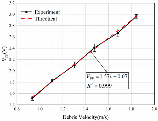 In this experiment, the coil parameters were guaranteed to be constant, and the wear debris diameter was 0.4 mm. The speed of the wear debris was controlled by a stepper motor. Six sets of speeds were set: 0.93 m/s, 1.11 m/s, 1.30 m/s, 1.48 m/s, 1.68 m/s, and 1.84 m/s. Figure 15 shows that there is a linear relationship between the wear particle velocity and the value for the Vpp signal. The difference between the experimental results and theoretical results is mainly because the induced voltage signal in the experiment is affected by noise and voltage drift.