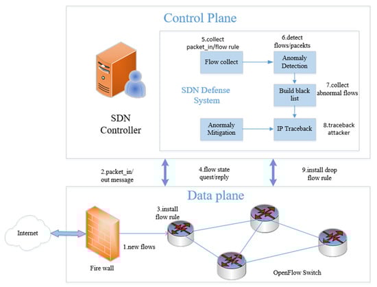 The SDN defense system is deployed on the SDN controller, and its specific workflow is shown in Figure 2. When the packet_in event occurs, the SDN controller will extract the header feature fields of the packet_in packet with the ofp_packet_in command and send these fields to the controller’s exception detection module to determine if it is normal. If the packet is normal, it is indicated by 0; if it is abnormal, it is indicated by 1, and the packet information is sent to the blacklist. At the same time, every 1s, the SDN controller requests the flow table information to the switch through the ofp_flow_stats_reques command. Then, the controller sends the collected flow table information to the abnormal detection module, and the abnormal detection module represents the normal flow by 0 to carry out normal forwarding. Abnormal flows are represented by 1 and sent to the blacklist. Finally, the IP traceback method [] improved in this paper is used to check the abnormal traffic information in the blacklist library, find out the control domain where the attacker resides, and send flow rules to the control domain through ofp_flow_mod message to block the attack source port, to reduce the impact of DDoS attacks in SDN. The workflow is shown in Algorithm 1.