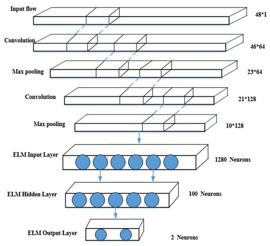 In this section, we describe our hybrid model in detail. Figure 3 shows the architecture of our CNN-ELM. As can be seen from Figure 3, our network consists of two phases: feature extraction and classification. The stage of feature extraction includes convolutional layers and max pooling layers; the classification stage uses single hidden layer feedforward neural network ELM for classification. We also give the relevant parameters in detail, for example, the number of each filter, the size of each feature mapping, the kernel size of each filter, and the step size of each sliding window. For example, the first stage convolutional layer consists of 64 filters with a kernel size of 3 × 3 and a sliding window step size of 1, and the activation function is Relu. The second stage does a stride size of 2 and the kernel is a 2 × 2 maximum pooling, and the third stage convolutional layer consists of 128 filters with a kernel size of 3 × 3 and a sliding window with a step size of 1, and the activation function is Relu. The fourth stage does feature mapping which is a 2 × 2 maximum pooling. The fifth stage transforms the previous stage feature mapping into a one-dimensional vector and combines the ELM model to make it favorable for classifying DDoS attacks with normal flows, and we next describe in detail the design of the part of the hybrid model.