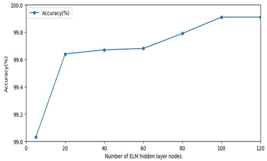 After the convolutional and pooling layers, the ELM method is used to classify the one-dimensional vectors transformed by feature mapping. The training mode of ELM is to generate input weights and hidden layer deviations randomly, and we only need to set the number of hidden layer neurons to calculate the output weights. Unlike the traditional training mode, it does not require iterative operations, which not only improves the training speed but also improves the generalization ability of the neural network. To determine the number of nodes in the hidden layer of the ELM network, this paper selects the Sigmoid activation function and the number of nodes in different hidden layers for experiments under the condition of CNN network structure. Experimental results are shown in Figure 4. When the number of hidden layer nodes is 100, relatively optimal anomaly detection accuracy can be obtained.