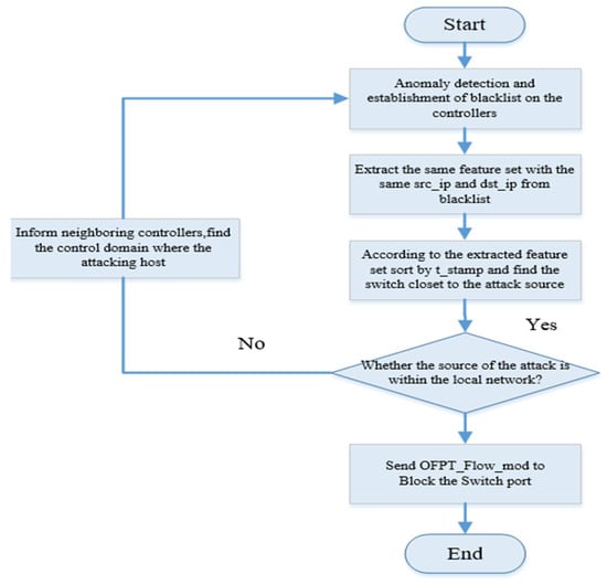 At present, methods for anomaly detection of DDoS attacks in SDN are mainly divided into the following three categories: methods based on information statistics, methods based on machine learning, and methods based on deep learning []. Among the methods based on information statistics, the classical method is to use information entropy to calculate the changes in some characteristics of packets (such as the source/destination IP address of packets) to evaluate the abnormal situation of network traffic []. On the one hand, the detection accuracy of this method depends on the threshold value of entropy, but the selection of the threshold value depends on expert experience and the subjective judgment directly affects the detection accuracy. On the other hand, the method of information statistics is suitable for considering a small number of features; thus, it can easily lead to false detection. Subsequently, many researchers tried to use machine learning methods to detect DDoS attacks [], such as support vector machines, decision trees, random forests, and other methods. Their performance is better than information statistical methods, but they have good results for processing low-dimensional features and small-sample data and are not suitable for high-dimensional and large-sample data detection. However, deep learning provides a good solution to the limitations of traditional machine learning. Deep learning methods (such as convolutional neural network, recurrent neural network, and graph neural network) can learn features and represent high-dimensional features into abstract data features, which can quickly and effectively process high-dimensional and large-sample data. At present, most of the anomaly detection methods based on deep learning use a single model, which cannot be well detected according to the characteristics of anomalous traffic and cannot guarantee real-time detection and detection accuracy. More importantly, existing DDoS attack defense methods only emphasize attack identification, with less research on mitigation strategies. On the one hand, some researchers migrate excessive anomalous traffic to other controllers for processing [], which not only increases the workload of controllers in other domains but also increases the time delay, which is not beneficial for defending against DDoS attacks. On the other hand, other researchers put the normal traffic detected in the previous step into the self-built whitelist [] and clear the abnormal traffic detected in the database that does not conform to the whitelist. However, none of the above mitigation methods consider the source of the attack, and eliminate the abnormal traffic from the source.