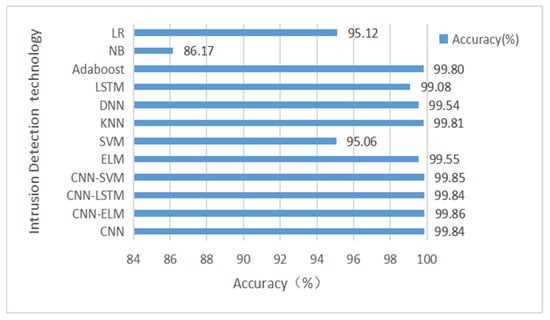 We used two datasets for testing: first, we trained and tested our model CNN-ELM using 12 feature subsets and 48 feature subsets from the CICIDS-2017 dataset, respectively, and the results obtained are compared with the results of other models as shown in Table 9 and Table 10. The accuracy comparison is shown in Figure 7 and Figure 8.