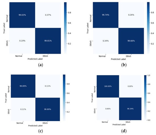 To compare our models more intuitively, we compare the CNN, CNN-LSTM, and CNN-SVM models with the CNN-ELM hybrid model, respectively, and their confusion matrix plots are shown in Figure 10. Although the result of the CNN-SVM model is better than that of the CNN-ELM model proposed in this paper, the parameter setting of the CNN-SVM model is complex, it relies too much on expert experience and the training time of the model is long, so it is inferior to CNN-ELM model. On the whole, the CNN-ELM detection model proposed by us has a high detection rate and a low false positive rate, which is suitable for deploying in SDN for real-time DDoS attack detection.