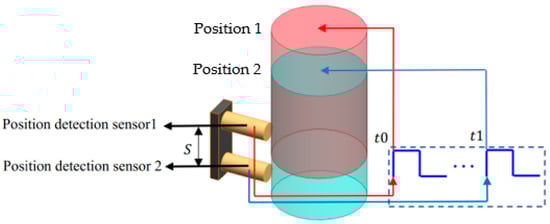 In Figure 1, two position detection sensors are placed at the impact position. Position detection sensors are used to record the time when the falling weight sweeps over the sensor. Position 1 and Position 2 are the positions of the falling weight detected by sensor one and sensor two, respectively. The moment is recorded when the sensor detects the falling weight. Furthermore, the time of the falling weight passing over two position detection sensors can be calculated. Finally, the impact velocity can be calculated according to Equation (1):