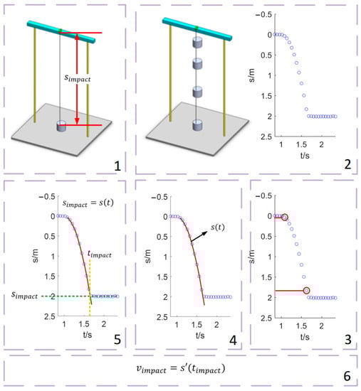 Specific steps of TPMM. 1. Impact position measurement; 2. Falling trajectory measurement; 3. Data identification of free-falling stage; 4. Falling trajectory expression fitting; 5. Impact time calculation; 6. Impact velocity calculation.