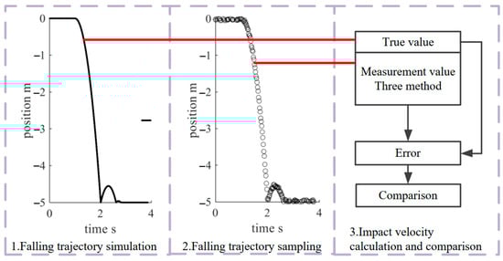The impact velocity can be calculated by measuring the falling height if the air resistance is ignored, but this will cause large error []. If an accurate falling trajectory is obtained, the measurement error caused by air resistance can be corrected. The falling height is easy to measure with an ordinary low-speed sensor while the falling weight is stationary at the impact position. Based on this, this study proposes a measurement method that can accurately capture impact velocity without high-speed sampling. The laser displacement sensor is used to measure and fit the falling trajectory of the falling weight. After that, the accurate impact time is derived by combining the impact position and the falling trajectory. Finally, the impact velocity can be obtained by bringing impact time into the first derivative of the falling trajectory. We call the proposed method the trajectory-position measurement method (TPMM for short). Through simulation and actual experiment, the impact velocity can be measured accurately and stably by a low-speed sensor.