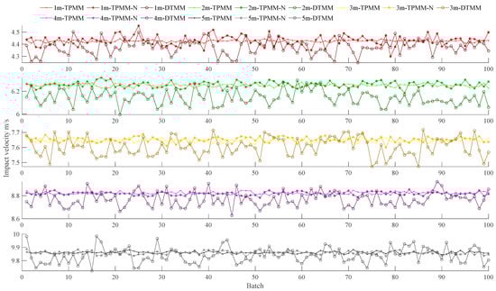 In addition, for the sensors used in the actual experiment, although the nominal error of the sensor is , part of the error is systematic error, and the random error is less than . DTMM only cares about two close positions near the impact, and part of the systematic error is offset when calculating the distance in Equation (15). Therefore, the accuracy of the sensor is higher for DTMM. During DTMM simulation, the error of the sensor is set to ± 1 mm.