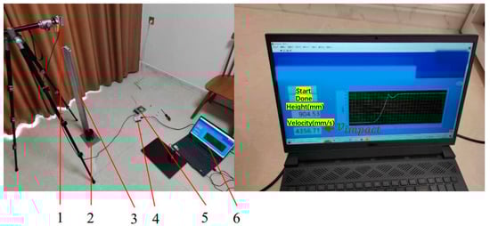Actual experiment device. 1. Laser displacement sensor; 2. Falling weight; 3. Guide rail; 4. Data acquisition system (Ni DAQ); 5. Power supply; 6. Computer.