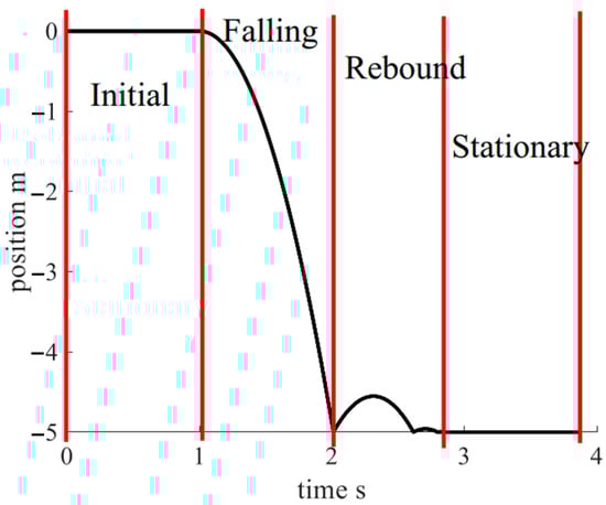 The impact velocity is an instantaneous quantity, and the current method requires the sensor to have a high-speed to improve the capture accuracy. However, under the premise of high response speed, it is challenging to require the sensor to maintain high measurement accuracy and stability simultaneously. The TPMM in this study captures impact velocity by impact position. As shown in Figure 8, during the measurement process, the whole falling stage can be divided into the initial stage, the falling stage, the rebound stage, and the stationary stage.