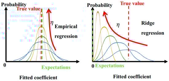 In addition to the impact location, another key is the fitting of the falling trajectory. The regular terms of empirical regression can improve the stability of fitting results. According to Equation (7), the empirical regression algorithm is similar to ridge regression []. Both regression algorithms contain regular items. In Figure 9, as the weight of the regular term ( in (6)) increases, the distribution of the fitted coefficient changes from a ‘wide-low’ type to a ‘narrow-high’ type, indicating that the variance is constantly decreasing. Meanwhile, the expectation of a fitted coefficient tends to the value set by the regular term. For the ridge regression, the regular term is set to 0. The fitted coefficient then gradually deviates from the true value while the expectation tends to 0, and the accuracy gradually decreases. For the empirical regression, the regular term is set to theoretical approximation that is very close to the true value. So, the accuracy loss can be significantly reduced while the variance is reduced. Thus, the uncertainty can be greatly reduced while maintaining accuracy.